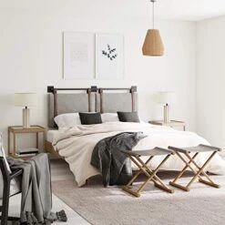 Harlow Modern Wall Mount Hanging Upholstered Headboard, Queen, Gray With Brown Faux Leather Straps