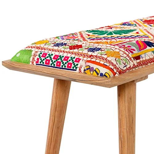 - Upholstered Bench. 18″H x 45″W x 15″D. Made in India. Available in Multi. Design/Look : Bohemian & Eclectic, Transitional. Material : Wood. Finish : Wood Finish. Pattern : Geometric. Bench type : Vanity Bench. Frame material : Manufactured Wood, Wood. Print : Pattern. Assembly : Assembled. Color : Blue, Cream, Green. Handmade