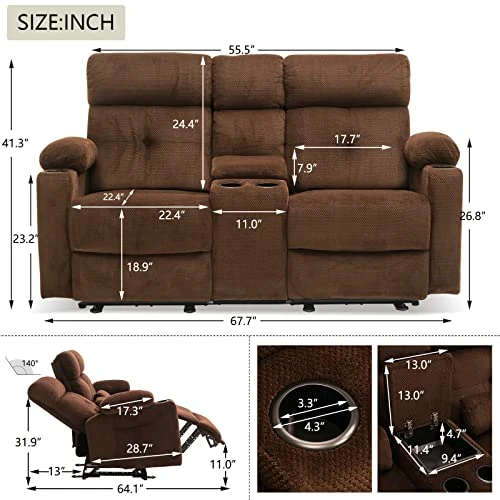 - 💎【COMFORT & MULTY-FUNCTION】The reclining loveseat has a center console with a depth of approximately 4.7”, can hold your glasses as well as things like your reading magazines. Two side pockets give you a more convenient way to store your phone or other small items. At the same time, there are four cup holders, which are convenient for you to store drinks or cups. The thick headrest, backrest and armrests are wrapped with baby velvet, which is softer, less prone to pilling, won’t deform