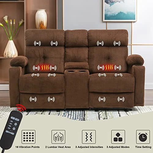 - 💎【MASSAGE & LUMBAR HEATING】Each side of this loveseat recliner can be controlled individually. Each side has 8 vibration points, 3 intensities & massage modes, and 3 times to choose, allowing you to relieve muscle pain and atrophy after long hours of work. The addition lumbar heating function can further promote blood circulation during massage. By the way, it has self-protection settings, it will automatically power off after 10 minutes or 15 minutes of use to avoid accidents