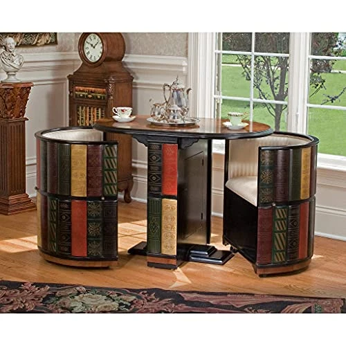 - HIGH-QUALITY WOODEN HEIRLOOM – A hand-painted, lacquer-finished top of faux burled wood with ebony trim tops our library table with two tone-on-tone cushioned barrel chairs on casters.