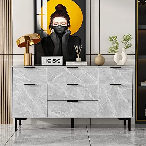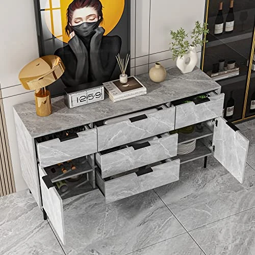 - [Large Capacity] – Featuring 5 spacious drawers and 2 cabinets with doors, the sideboard buffet cabinet provides various storage to store your bowls, plates, containers, liquors and so on. The shelves are adjustable to fit your larger stuff. The 55.1 inch desktop is ideal for displaying microwave, coffee machines, etc.