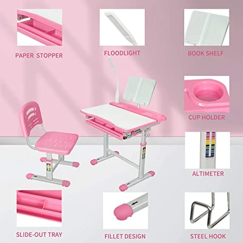 - 【Humanized Design】 Pull out drawer has a large capacity to store a pencil, markers, paper, and other little essentials. The adjustable reading shelf is great for reading while writing, or copying material from a book. Dedicated hooks of our study table features help your child stay organized.