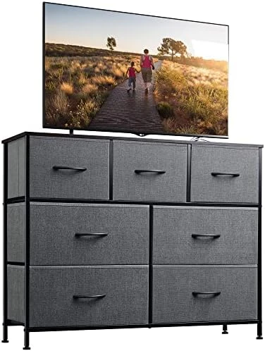 - Measured 39.4″ L x 11.8″ W x 30.5″ H, the chest of drawers can also be used as TV stand. This media console table is ideal for television up to 45″. The fabric bins are great to store CDs, DVDs, game controller, etc.