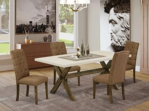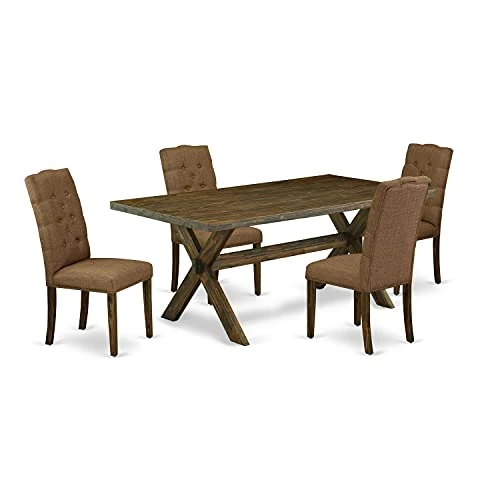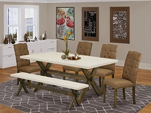 - [KITCHEN DINING TABLE SET FINSH] This dinette set has a Distressed Jacobean hardwood wood dining room table top and a Distressed Jacobean color kitchen dining table legs and a beautiful Brown Beige Linen Fabric dining room chairs seat and high back that bring elegance to your dining area and boost the beauty of your amazing dining room.
