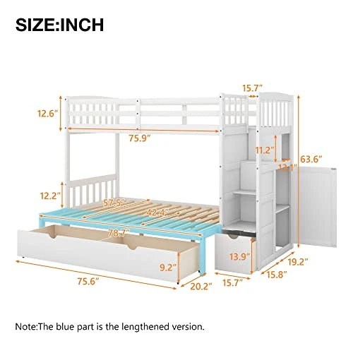 - Space-saver: comes with drawers, staircase and inseparable under-bed drawers. Convenience: wheels attached to drawers makes it easy to pull in and pull out. Safety ensured: full-length guardrails and solid frame. ④ 3 Beds in 1: twin size upper bed and convertible twin/full size down bed. ⑤ Assembly required. Material Info: Pine wood+MDF. Size: Twin over twin/full. Function: Twin-over-twin/full bed. Decoration : Convertible twin/full size down bed. Numbers of package: 3