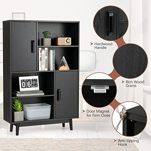 - Stable and Safe Design: Resting on solid rubberwood legs with anti-scratch foot pads, this 4-tier bookshelf with doors and shelves stands stable and balanced with a high loading bearing capacity. The anti-tipping devices firmly mount the bookshelf against walls to prevent accidental falling and add safety for the family.