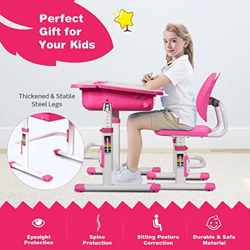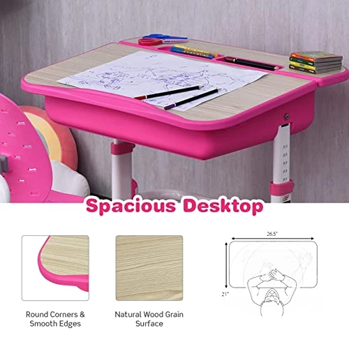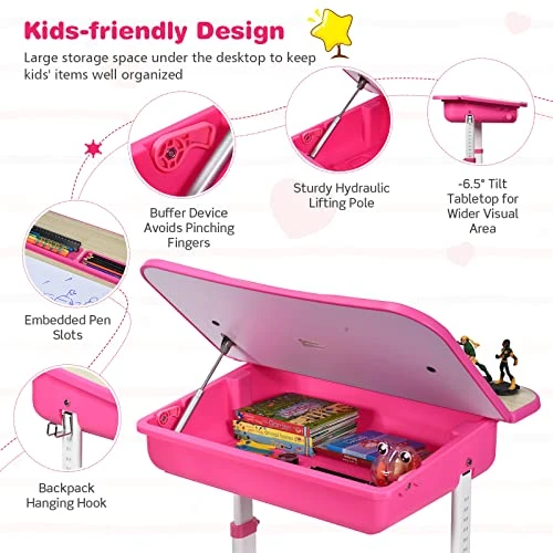 - 【Spacious & Tilted Desktop】: The 26.5″ x 21″ (L x W) desktop with an inclined 6.5° angle provides a wide area for kids to write, read, draw while promoting good posture for children to protect their eyesight. Besides, there is a sturdy hydraulic lifting pole under the desktop for smooth lifting and a buffer device to avoid pinching kids’ fingers.