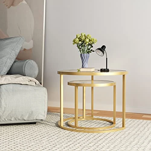 - 【Gold glass nested table】This round nesting coffee table features a high-quality tempered Blue Plated Glass top, good heat resistance,the legs are painted with high temperature, no odor, scratch-resistant, which is perfect for living room,bedroom,balcony and offices.