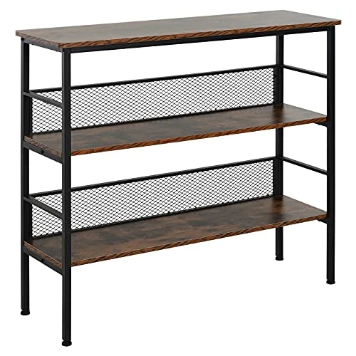 - METAL BACKING: the back of the bottom two shelves of this wood shelf are made of metal mesh, making sure your items don’t fall to the floor.