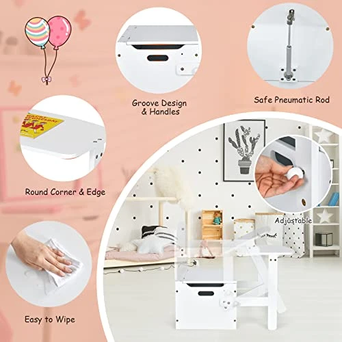 - 【Premium Wooden Material】This kids table and chair set is made of sturdy wooden material with table top maximum weight capacity up to 22 lbs and chair maximum weight capacity up to 66 lbs. And round polished corner effectively protects kids from hurt and built-in pneumatic rod is designed for convenient open and close.