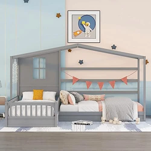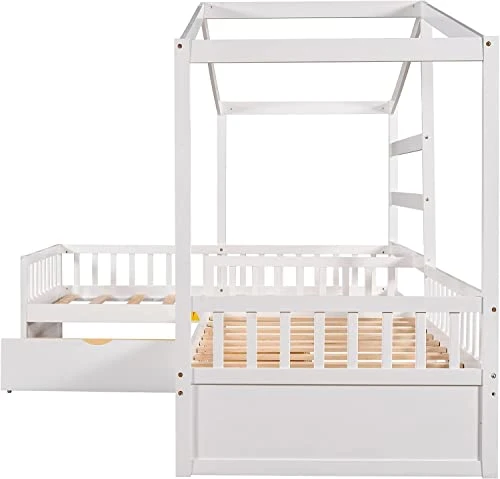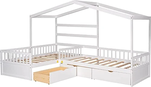 - 【House Bed With Storage and Fence】This L-shape house beds with 3 large drawers underneath which can be organized toys, books or bedding. and the montessori bed featured cute fence railings design , transform your little one’s bedroom into a soothing, magical space that’s perfect for play and sleep.