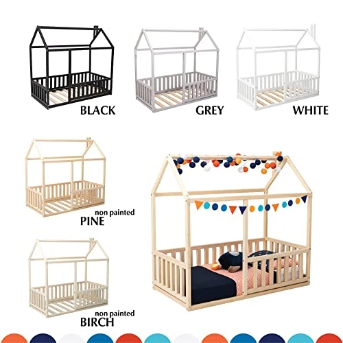 - For painted kids beds, we use EU-certified water-based VOC-free paint. House bed frame is very sturdy, you can sleep in it together with your little one.