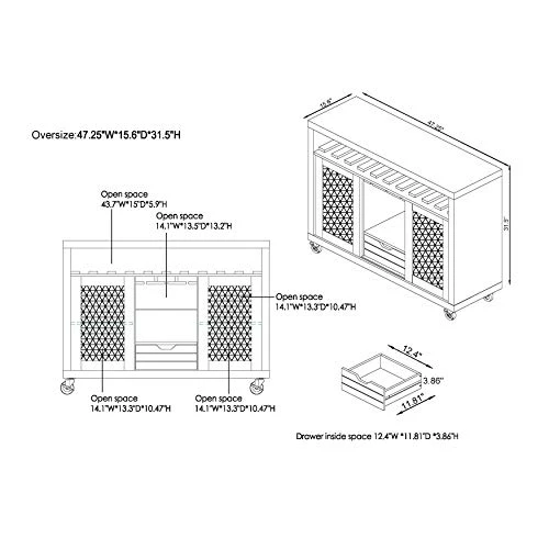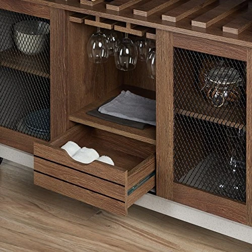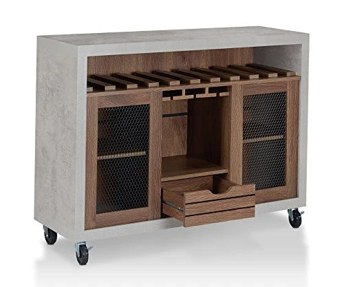 The Vesta buffet features an industrious cement-like design and a stylish contrasted finish. Wine bottle can be elegantly displayed on its spacious wine bottle rack and stemware glass racks keep wine glasses conveniently placed. Mesh paneled cabinets provide ample storage with its generous tiered shelves and a slatted center drawer gives your additional room to store bar essentials. Resting on caster wheels, the Vesta buffet adds functionality and versatile industrial design to your home.