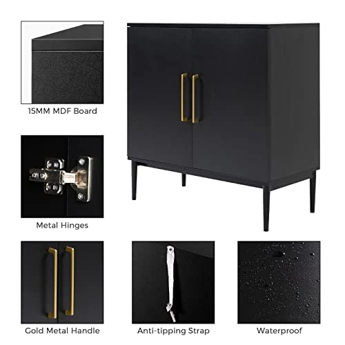 - 【Stable Construction】The sideboard is made of high-quality 15MM MDF wood (meeting E-0 environmental protection standard) for a long-lasting construction, which is strong enough to stand the microwaves, mixers, blenders and even coffee machines. Waterproof and moisture-proof surface,great coating with moisture resistance, easy to clean. Equipped with metal soft hinges and gold handles,makes this cabinet waterproof, scratch-resistant and wear-resistant. 2 Door is easy to open and close. The legs separates the wood from the ground to prevent moisture.