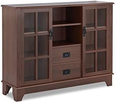 - Extremely functional, the Dubbs cabinet features both open storage and drawer and framed glass door storage.