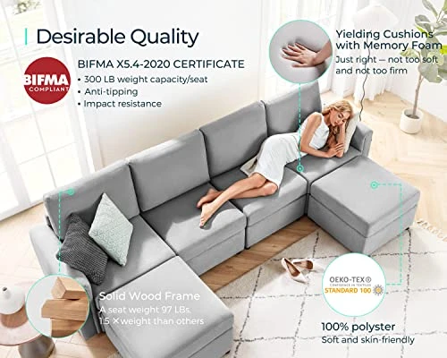 - 【Memory Foam Cushion & Safe Polyester Fabric】 The yielding cushions of large sectional couch’s are filled with memory foam and steel springs for your relaxation and comfort. The seats are just right — not too soft and not too firm. The sofa fabric is tightly woven 100% polyester, CA65 and OEKO-TEX certificated, which means you can be certain that every component of this article has been tested for harmful substances and that the article therefore is harmless for human health