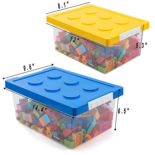 - ❤SET OF 2 STORAGE BINS – The package includes two Lego-shaped toy storage boxes of different sizes. Large bin with blue lid: 14.4” x 9.6” x 6.5”; Small bin with yellow lid: 12” x 8.1” x 5.3”. Kids toy storages containers are luxuriously selected high-quality PP material, without any harmful ingredients. Completely healthy and safe, your baby and family can use them with peace of mind.