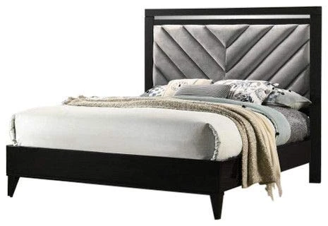 - Featuring a gorgeously upholstered headboard with silver accents for a sophisticated finish.