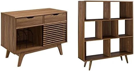 - SPACIOUS STORAGE – Sitting on tapered legs, this contemporary record stand features a particleboard frame with wood grain laminate, a sliding slatted door, and two spacious drawers
