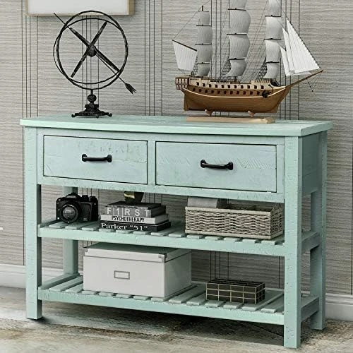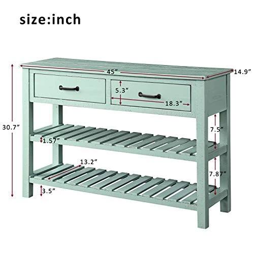 - ❤LARGE STORAGE SPACE: Size: 45″L ×14.9″W ×30.7″H. This sofa table features with its two complete storage drawers and large open slatted lower fixed shelves. You can place bowls, plates and vases or anything you want to place.