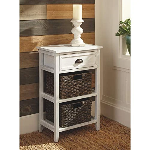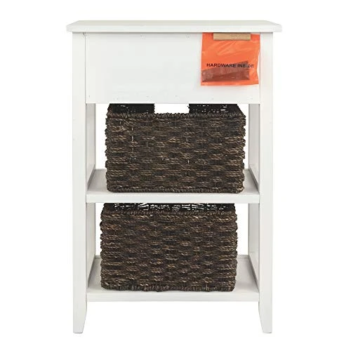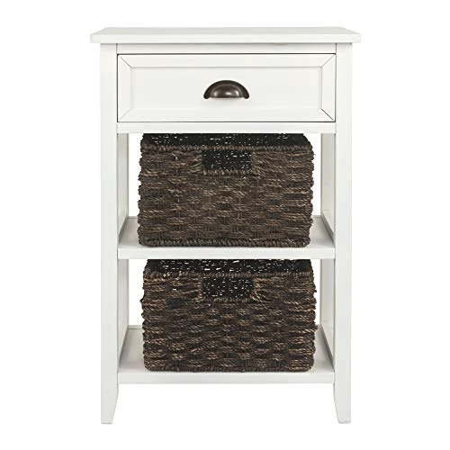 - HANDSOMELY CRAFTED: Made of veneers, wood and engineered wood. Designed with 2 removable woven baskets, 1 drawer, a fixed shelf and cup pull hardware in an antiqued bronze tone finish