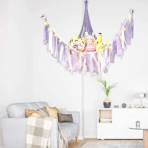 - Decorate Style: Plush hammock storage net with a free 1.5m LED star chain light. (Batteries not included), With 3 adhesive hooks and 3 screw-in hooks, it can be used as a night light. Decorated with pom poms and led lights, this hanging stuffed animal net will add a bohemian style to keep your room more loving. A fun way to store your child’s toy collection.