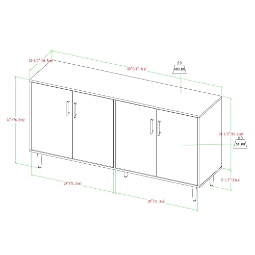 - Dimensions: 30” H x 15.5” D x 58” L, Interior cabinet: 24.5” H x 15.5” D x 28” L