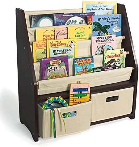 WonkaWoo Kids Sling Bookshelf Wooden Rack, 4 Levels Of Canvas Slings For Large Children Books And 2 Storage Bin Boxes For Toys Organizer, Espresso Shelf With Natural Fabric Slings
