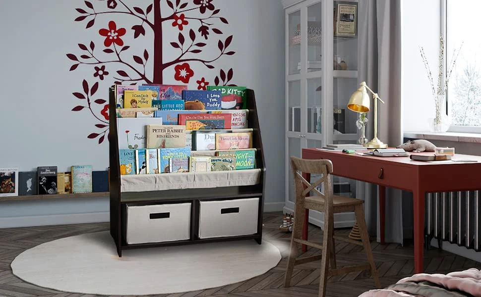Be the first to review “WonkaWoo Kids Sling Bookshelf Wooden Rack, 4 Levels Of Canvas Slings For Large Children Books And 2 Storage Bin Boxes For Toys Organizer, Espresso Shelf With Natural Fabric Slings” Cancel reply